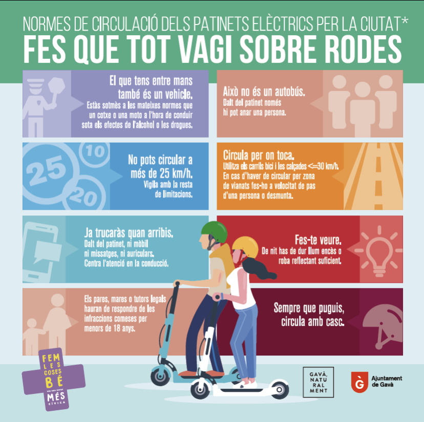 Per tal d’acostar la normativa als usuaris dels patinets elèctrics, l’Ajuntament de Gavà ha editat un fulletó informatiu on es recullen les principals infraccions. Aquest fulletó es distribuirà en equipaments municipals i centres educatius de Secundària.