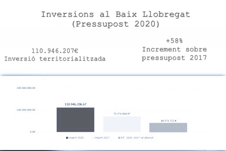 Els nous pressupostos de la Generalitat per al 2020 destinaran 110.946.207 € en inversions a la comarca del Baix Llobregat. Aquests comptes suposen un increment del 58% respecte als de 2017 i inclouen diferents projectes d’infraestructures, millora i ampliació d’equipaments i serveis a les persones.