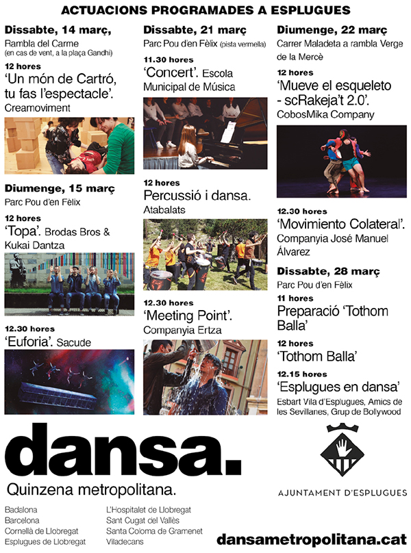 Del 13 al 29 de març arribarà a Esplugues i a set municipis més de l’àrea metropolitana, la 3a edició, de la Quinzena de Dansa Metropolitana.Sota la premissa de “la dansa no té fronteres”, segons l’organització, arrenca amb una programació molt variada, amb espectacles que dialoguen entre generacions, companyies de sempre i noves, amb diferents estils i disciplines com les arts visuals, l’esport o les arts de carrer.