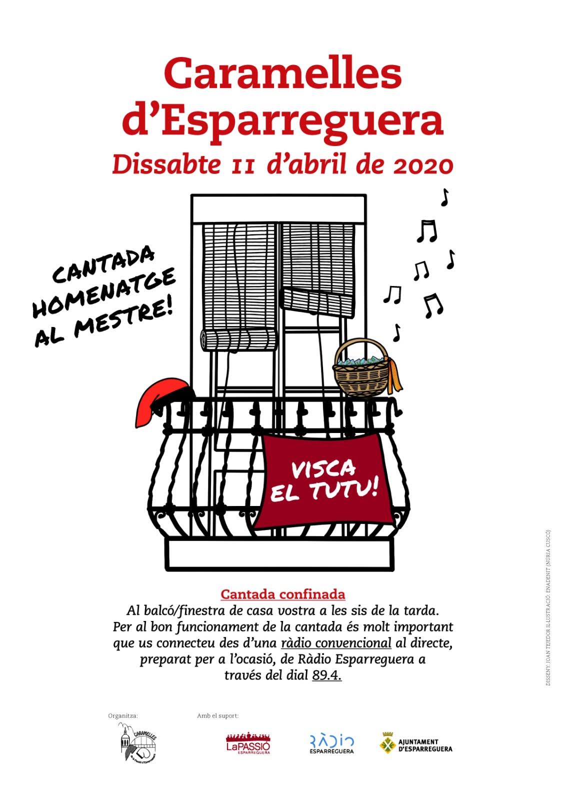 La cantada excepcional d’aquest any, se celebrarà als balcons i finestres de la vila, i ho hem batejat amb el nom de “Cantada confinada”, els Caramellaires de La Passió d’Esparreguera convoquem a tots els esparreguerins i esparreguerines que ho vulguin aquest proper dissabte 11 d’abril a les 6 de la tarda als balcons i finestres de cada casa.