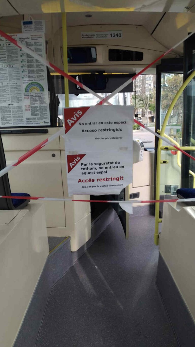A més, com es pot apreciar en aquesta altra fotografia, l’espai que queda més a prop del conductor està aïllat per tal que cap passatger es pugui apropar: “Es posa aquest precinte en tots els autobusos en els seients més propers als conductors, el del seu darrere i el més proper a la porta davantera, i així bloquegem aquests seients per tal que ningú pugui seure”.
