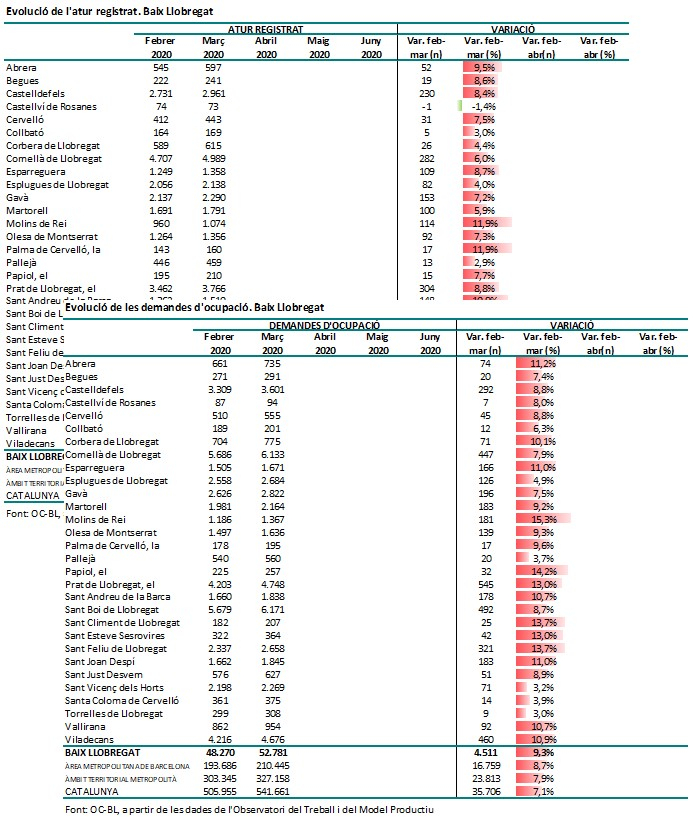 Així, el mes de març es veu com creixen en 4.511 el nombre de persones demandants d’ocupació al Baix Llobregat, de les quals 2.875 corresponen a atur registrat, 22 a altres col·lectius no ocupats i 1.164 a la resta de demandants, que aplega, entre d’altres, el conjunt de demandants ocupats.