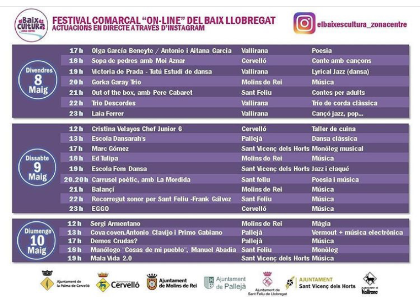 20 ajuntaments del Baix Llobregat han sumat esforços i molta creativitat per organitzar el primer festival ‘on line’ d’àmbit comarcal. Es tracta d’ El Baix és cultura, una iniciativa que vol posar en valor el talent cultural de la comarca, potenciant i donant suport als i les artistes locals a través d’un projecte comú que els obri també noves finestres més ellà del seu municipi, en un moment on el sector cultural està especialment colpejat per la crisi sanitària de la COVID-19. El certamen cultural començarà aquest divendres 8 de maig i es realitzarà de manera simultània als 20 municipis participants a través de quatre canals d’Instagram.