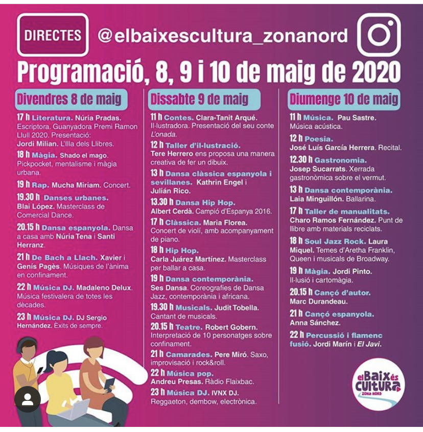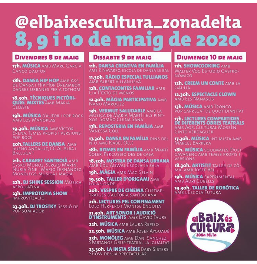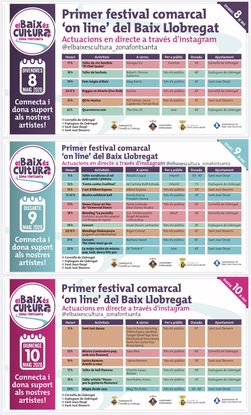 El Baix és cultura aplegarà més de 100 actuacions en directe, a través de quatre canals d’Instagram i amb els artistes actuant des de casa seva, des de cadascun dels 20 municipis. Per facilitar el seguiment de les activitats programades, els ajuntaments participants han dividit la comarca en quatre zones geogràfiques, amb un canal específic per a cadascuna d’elles: elbaixescultura_zonanord (Sant Andreu de la Barca, Martorell, Abrera, Sant Esteve Sesrovires i Esparreguera), elbaixescultura_zonacentre (Molins de Rei, Cervelló, Sant Vicenç dels Horts, Vallirana, Pallejà i Sant Feliu de Llobregat), elbaixescultura_zonafontsanta (Sant Joan Despí, Cornellà, Esplugues, i Sant Just Desvern) i elbaixescultura_zonadelta (Sant Boi, Viladecans, El Prat, Gavà i Castelldefels). Cada canal emetrà les activitats de les seves poblacions tot i que es farà una difusió conjunta.
