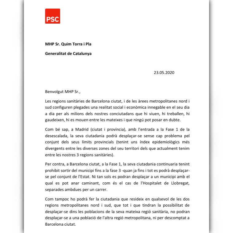 Els alcaldes del PSC de municipis de les àrees de salut metropolitana nord i sud han reclamat al president de la Generalitat, Quim Torra, que els seus municipis i Barcelona siguin un mateix “àmbit comú” de cara a la setmana que ve perquè s’hi pugui garantir la mobilitat.