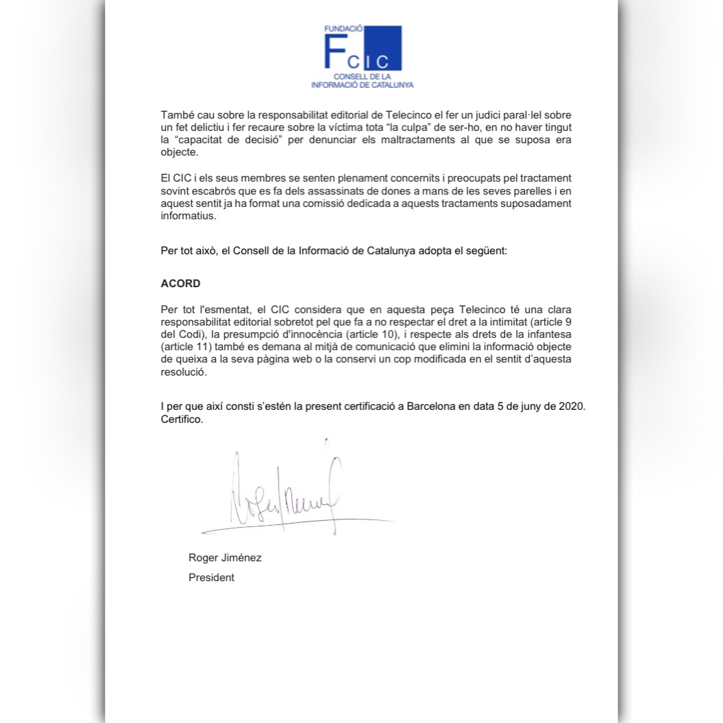 En resposta a una queixa de l’Ajuntament del Prat i amb el suport de l’Associació de Dones Periodistes de Catalunya (ADPC), el CIC ha resolt que “aquesta peça Telecinco té una clara responsabilitat editorial sobretot pel que fa a no respectar el dret a la intimitat, la presumpció d’innocència, i respecte als drets de la infantesa. També es demana al mitjà de comunicació que elimini la informació objecte de queixa a la seva pàgina web o la conservi un cop modificada en el sentit d’aquesta resolució”.