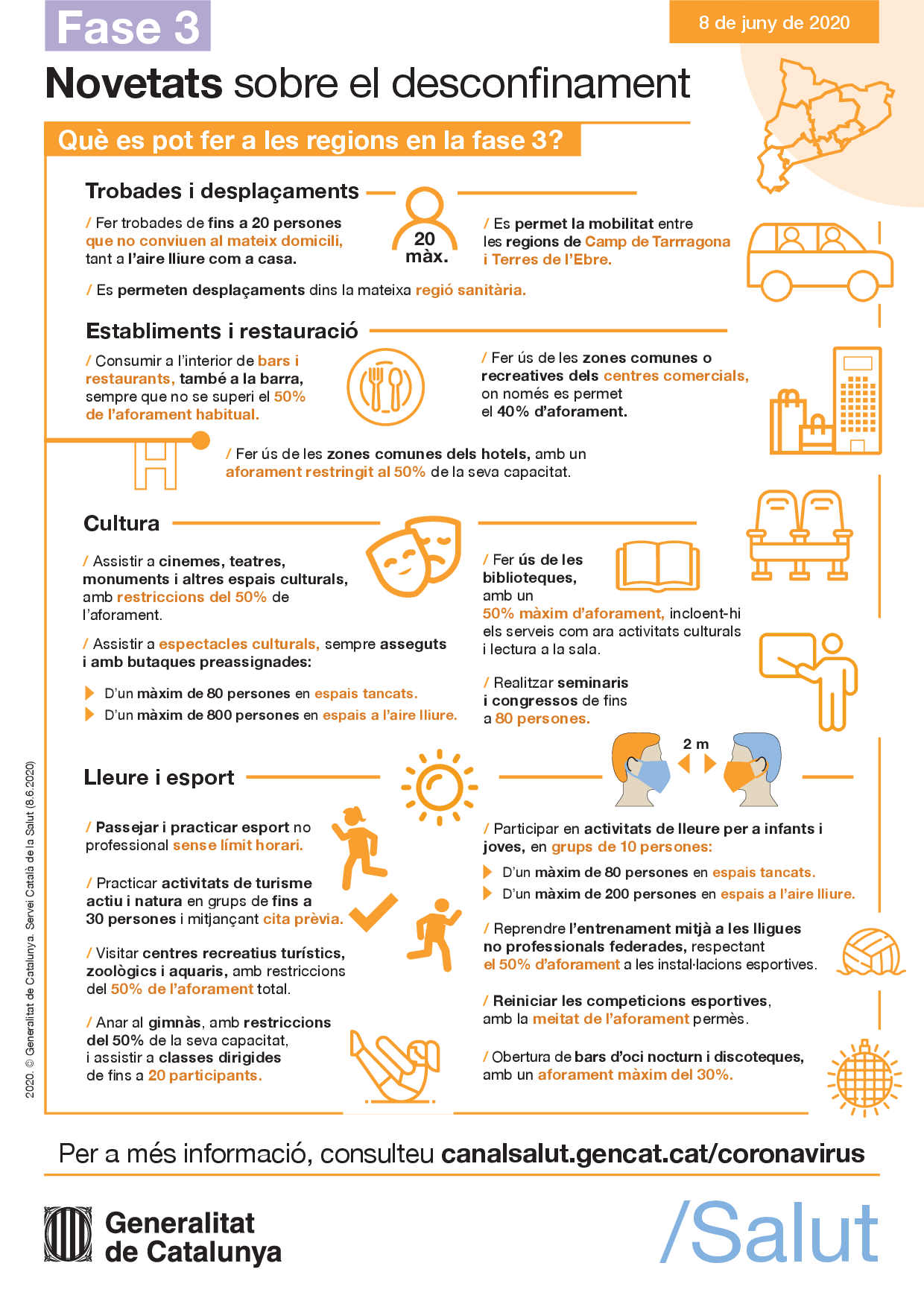 Així, des d’aquest dijous l’àrea de Barcelona i Lleida recuperen la mobilitat amb la resta d’unitats territorials de Catalunya que ja estan en fase 3, i per tant la mobilitat estarà permesa arreu de la comunitat autònoma. Un altre dels canvis més importants de la nova fase, és la desaparició de les franges horàries per a passejades i esport no professional.