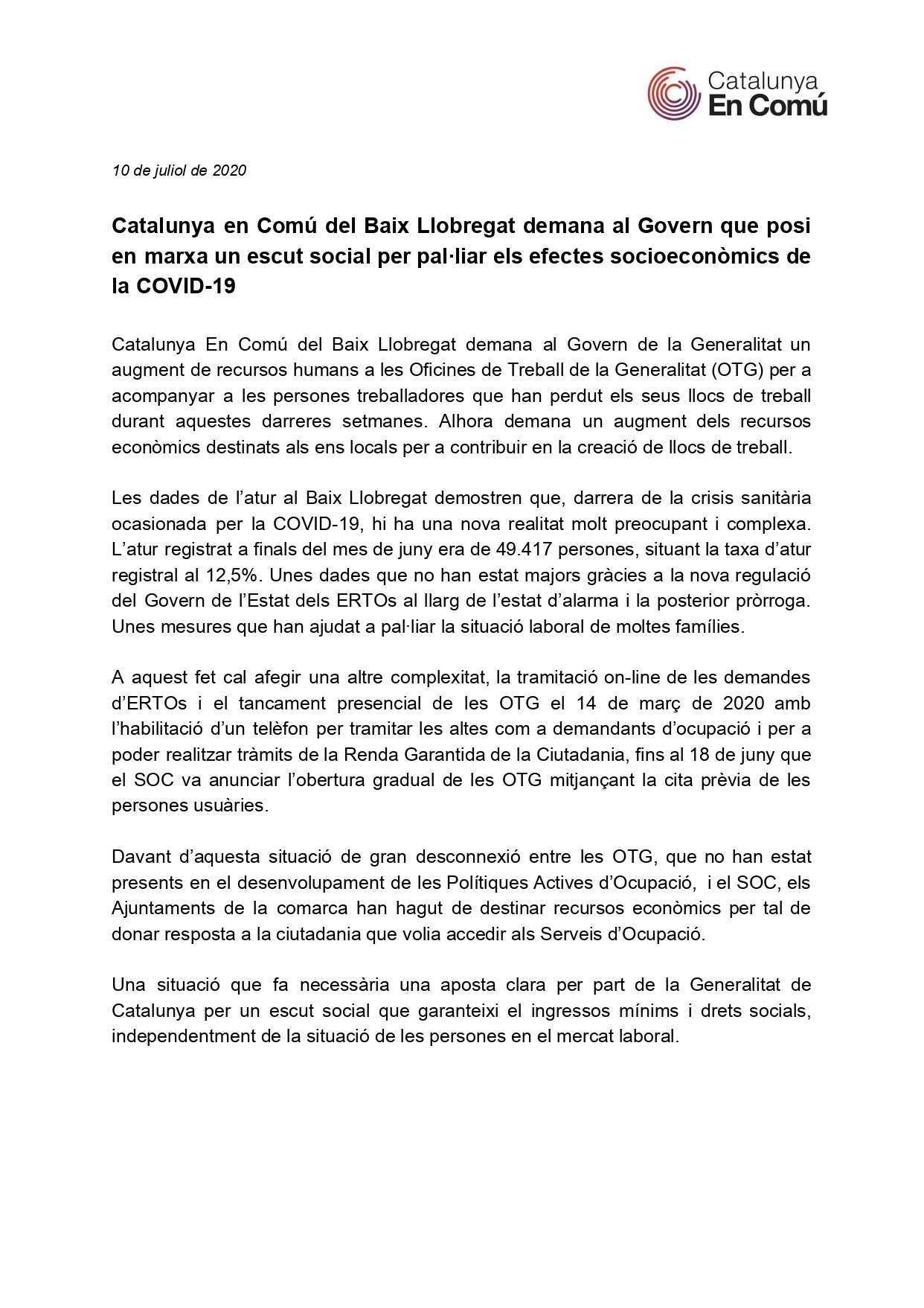 Catalunya En Comú del Baix Llobregat ha demanat al Govern de la Generalitat a través d’un comunicat, “un augment de recursos humans a les Oficines de Treball de la Generalitat (OTG) per a acompanyar a les persones treballadores que han perdut els seus llocs de treball durant aquestes darreres setmanes”. Alhora demana un “augment dels recursos econòmics destinats als ens locals per a contribuir en la creació de llocs de treball”.