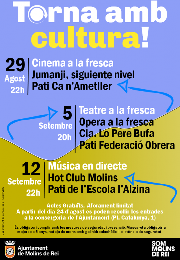 L’Ajuntament de Molins de Rei, i la seva regidoria de cultura, han elaborat tot un seguit d’activitats perquè el retorn de les vacances d’estiu estigui acompanyat de la cultura: tres propostes destinades a tots els públics que animaran els capvespres de la vila.