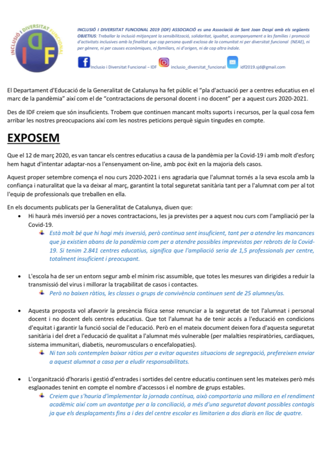 En resposta al “Pla d’actuació per centres educatius en el marc de la pandèmia” així com al de “Contractacions de personal docent i no docent per aquest curs 2020-2021” presentat per la Generalitat de Catalunya; INCLUSIÓ I DIVERSITAT FUNCIONAL 2019 (IDF) ASSOCIACIÓ sol·licita al Departament d’Educació, al Departament de Sanitat i al Síndic de Greuges de Catalunya, una sèrie de mesures per garantir l’educació i la seguretat sanitària, tant de l’alumnat com de tot l’equip docent i no docent.