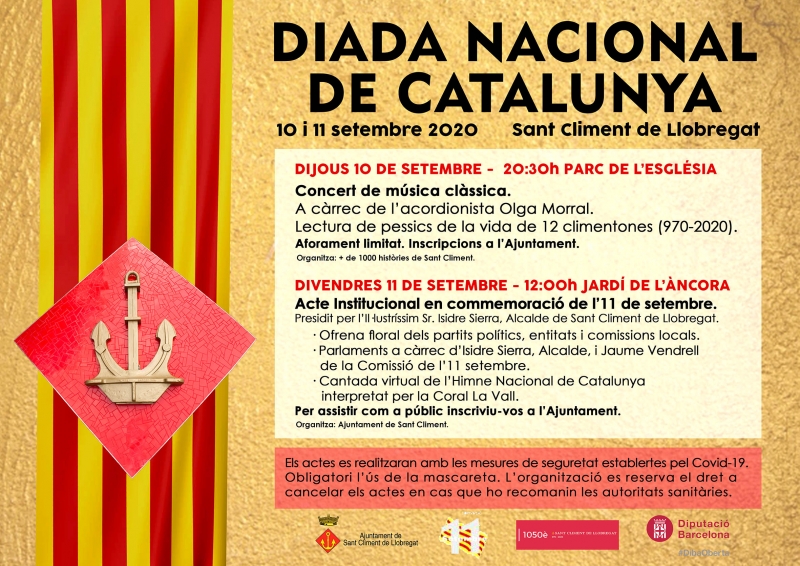 L’Ajuntament de Sant Climent ha decidit mantenir l’acte institucional que cada any realitza al Jardí de l’Ancora adaptant el format a les mesures decretades amb motiu de la Covid-19. En aquest sentit, fa una crida a totes les entitats del municipi que hi vulguin participar a inscriure’s a l’acte de manera prèvia i informa que, en aquesta ocasió, el nombre de persones per entitat que podran realitzar l’ofrena floral estarà limitat a un màxim d’1 persona.