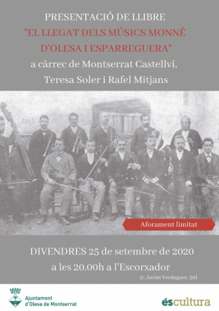 L’Escorxador va acollir aquest divendres la presentació del llibre “El llegat dels músics Monné d’Olesa i d’Esparreguera”. Serà a les vuit de la tarda amb aforament limitat i a càrrec de Montserrat Castellví, Teresa Soler i Rafel Mitjans, autors i autores del llibre. Els Monné d’Olesa i d’Esparreguera han estat una nissaga de músics des d’abans de 1850 i pràcticament fins a l’actualitat.