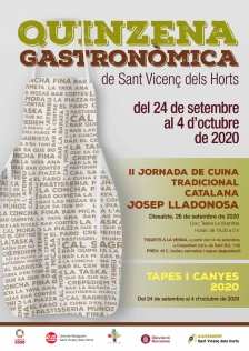 La gastronomia tornarà a ser la protagonista del calendari festiu i cultural de Sant Vicenç dels Horts, atès l’extraordinària qualitat dels productes i professionals de la restauració local. Del 24 de setembre al 4 d’octubre se celebrarà la Quinzena Gastronòmica, que engloba dos esdeveniments singulars: la II Jornada de Cuina Tradicional Catalana Josep Lladonosa , i la 9a edició del Tapes i Canyes .