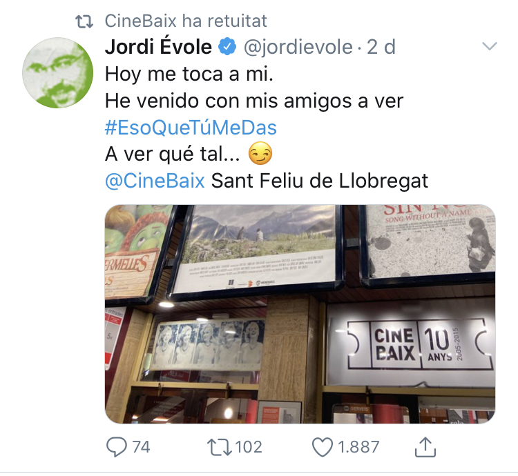 Cinebaix va posar en cartellera la setmana passada Eso que tú me das i dissabte dia 3 d’octubre el cinema santfeliuenc va vibrar quan el mateix Évole va entrar a la sala per visualitzar la pel.lícula, i fins i tot oferir una petita xerrada a les afortunades persones que hi eren presents.