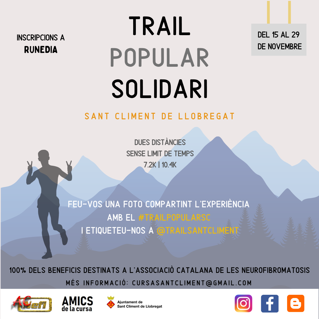 Amics de la Cursa amb el suport de l’Ajuntament de Sant Climent de Llobregat ofereixen aquests dies la possibilitat de participar del Trail Popular Solidari del municipi, una proposta que destinarà el 100 % dels seus beneficis a l’Associació Catalana de les Neurofibromatosis. En aquesta ocasió, i donada la situació de crisi sanitària en la qual ens trobem, se’ns convida a participar de l’activitat en el moment en que ho considerem entre els dies 15 i 29 de novembre.
