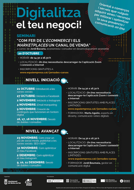 El cicle formatiu arrenca el dimarts 20 d’octubre amb el seminari Com fer de l’ecommerce i els marketplaces un canal de venda, a càrrec de Jordi Bacaria, expert en l’ecommerce pel comerç de proximitat i autor de l’estudi anual de digitalització del comerç a Catalunya.