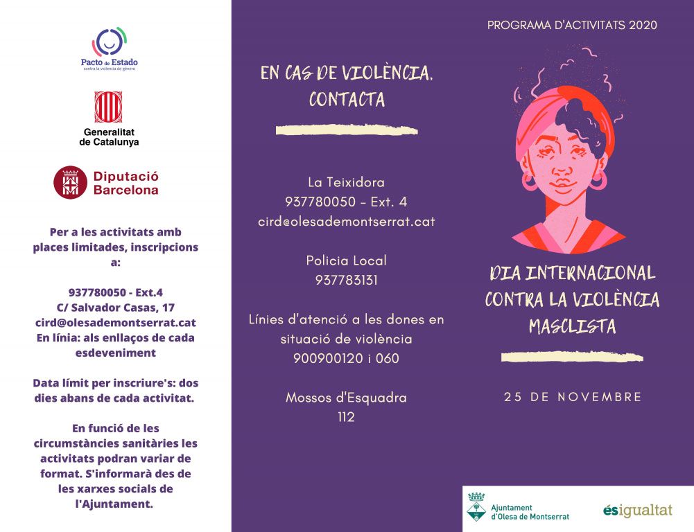 Les activitats d’aquest 2020 arrenquen dilluns  16 de novembre, amb l’obertura de la mostra juvenil Prevenció de les violències masclistes, que es podrà visitar a la Casa de cultura fins el 29 de novembre (en horari de 17.00 a 20.00 h). El dijous 19 de novembre es farà un debat virtual sobre el documental Les Resilients, que comptarà amb la seva directora, Cristina Madrid. El divendres 20 de novembres’instal·larà un punt lila al mercat ambulant, concretament a la Rambla de Catalunya, de 9.00h a  13.00h.