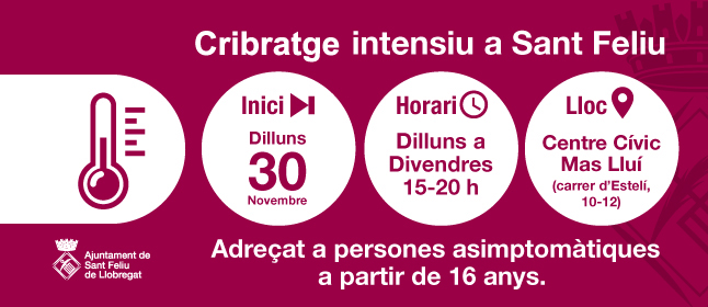 Les proves començaran dilluns 30 de novembre, i es portaran a terme de 15 a 20 h al Centre Cívic Mas Lluí (carrer d’Estelí, 10-12, accés per la plaça Dicià). Podran fer-se-les de forma voluntària tots els ciutadans i ciutadanes de Sant Feliu asimptomàtics majors de 16 anys que ho desitgin, sense necessitat de demanar cita prèvia. El test és gratuït, i per accedir-hi les persones interessades han de facilitar el nom i cognoms, adreça, telèfon de contacte i presentar la targeta sanitària. Per evitar aglomeracions, el dispositiu estarà en funcionament durant diverses setmanes.