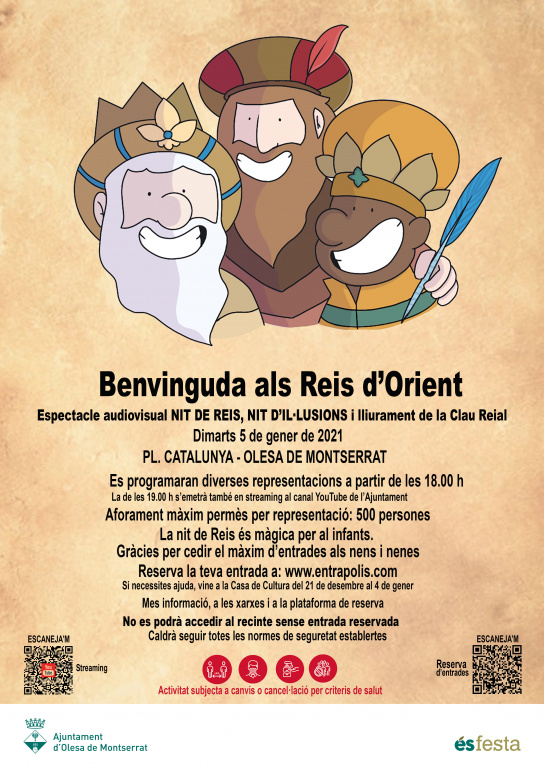 I a partir de les 6 de la tarda, la plaça de Catalunya serà l’escenari de la benvinguda als Reis d’Orient. Enguany la celebració dels Reis d’Orient serà diferent, però igualment màgica i amb molta il·lusió. Això sí, sota les màximes mesures de seguretat. Per donar la Benvinguda als Reis d’Orient, l’Ajuntament ha preparat un espectacle audiovisual amb el conte “Nit de Reis, nit d’il·lusions”, creat especialment per l’escriptora Pepa Fraile i narrat per diferents col·laboradors i col·laboradores de la vila. A continuació, l’Alcalde lliurarà als Reis d’Orient la clau màgica que obre totes les llars d’Olesa.