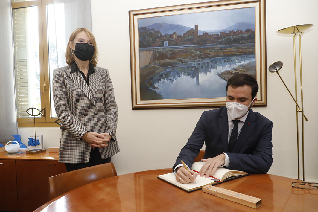 El ministre de Consum, Alberto Garzón, ha visitat avui l’Ajuntament de Sant Boi, on ha estat rebut per l’alcaldessa, Lluïsa Moret, en companyia del subdelegat del Govern central a Barcelona, Carlos Prieto, altres membres del govern municipal i portaveus de les forces polítiques amb representació al consistori.