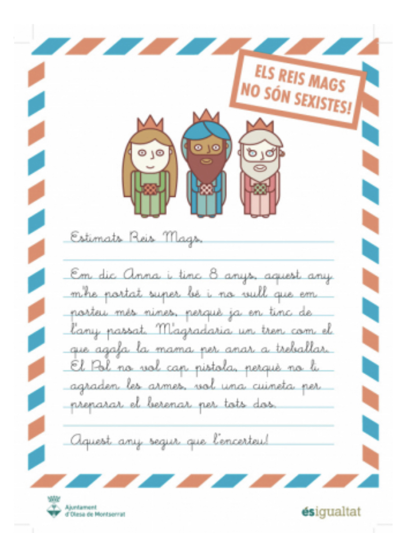 El departament de Gènere, Feminismes i LGTBIQ+ de l’Ajuntament d’Olesa de Montserrat ha impulsat per quart any consecutiu la campanya Les joguines no són sexistescoincidint amb les dates nadalenques i que consistirà en un seguit de cartells informatius i el repartiment de material divers a les escoles. Els cartells simulen una carta als Reis d’Orient amb un missatge adreçat a les famílies en general amb l’objectiu d’evitar que durant la infància es creïn estereotips i rols de gènere a través de joguines o determinats jocs que tradicionalment s’atribueixen a nens i a nenes. Com a novetat d’enguany, el departament recomanarà, a través de les xarxes socials de l’Ajuntament, sis vídeos elaborats per la cooperativa Cúrcuma i que tenen com a objectiu treballar el sexisme i els rols de gènere amb els infants: Ara em dic Joana, El Quim i les Barbies, La Mercè vol ser bombera, La Ventafocs ja no creu en prínceps blaus, No m’agrada el futbol i Quan les nenes volen alt.