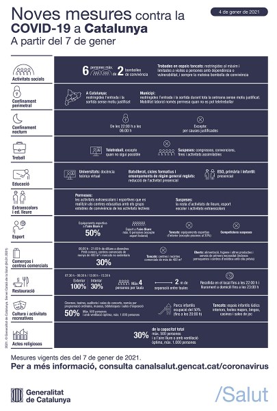 Del 7 al 17 de gener la Generalitat de Catalunya ha establert noves mesures restrictives de la mobilitat i de les activitats per intentar frenar l’augment de casos de Covid-19 a tot Catalunya. Cal destacar que entra en vigor de nou un confinament municipal cada dia de la setmana, és a dir, no es podrà ni entrar ni sortir del municipi si no és per causes degudament justificades.