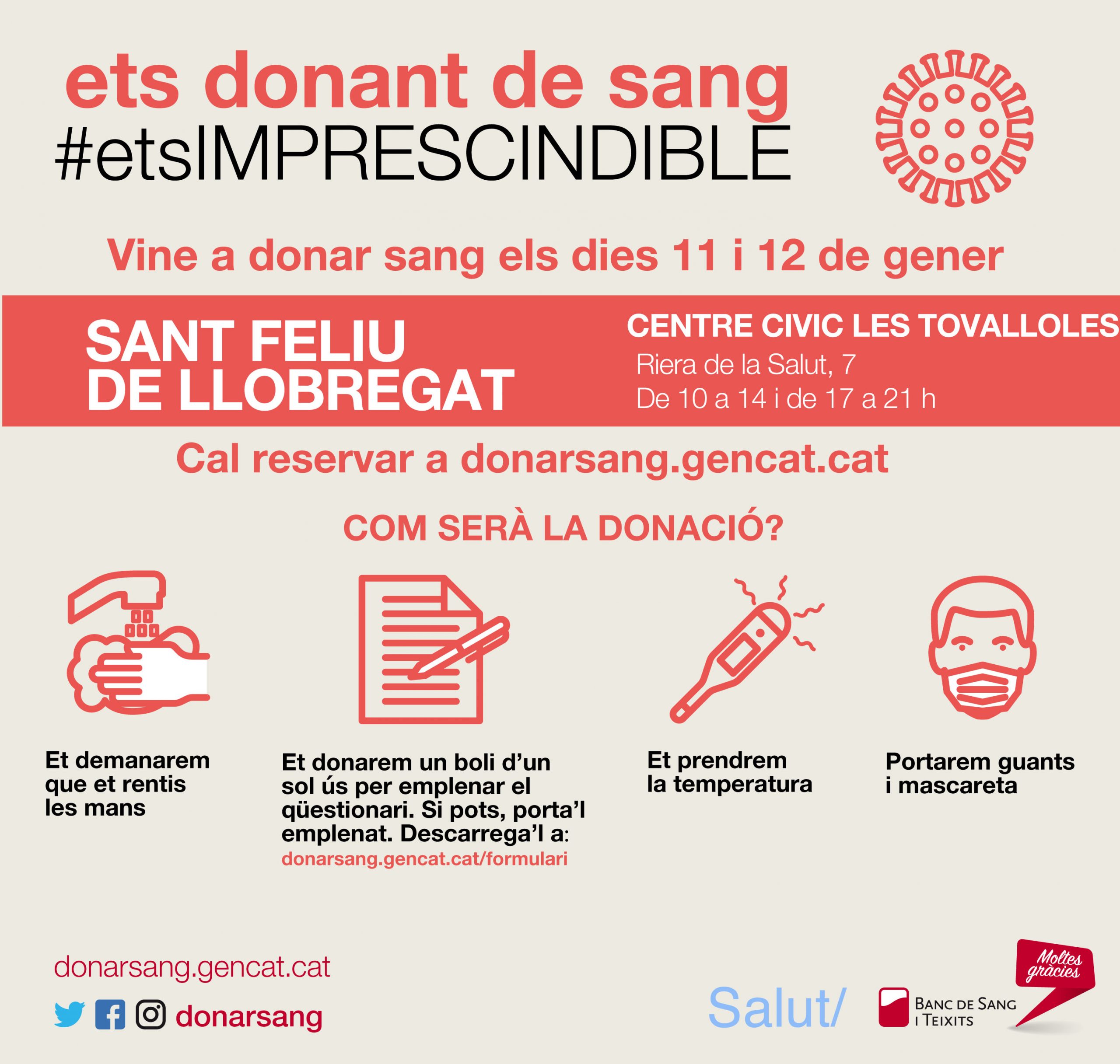 Sant Feliu s’ha sumat al conjunt de municipis que han ofert els seus espais per garantir les donacions de sang a Catalunya durant aquests mesos. Així, dilluns 11 i dimarts 12 de gener, el Centre Cívic Les Tovalloles (riera de la Salut, 7) tornarà a comptar amb un espai de donació en horari de 10 a 14, i de 17 a 21 h. Les persones que vulguin donar hauran de reservar dia i hora a donarsang.gencat.cat.