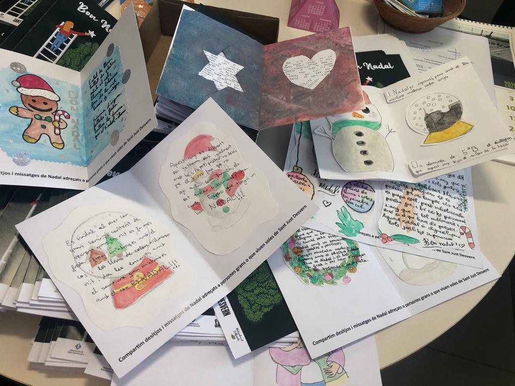 També ha estat sorprenent, la resposta per felicitar les festes a la gent gran de Sant Just. Amb l’objectiu de fer-li arribar l’escalf i un missatge solidari per aquestes festes, es van fer arribar postals a les escoles públiques i concertades, al Carrau Blau, a les Arts Plàstiques, a equipaments i alguns comerços, perquè infants i grans les omplissin amb bons desitjos. Després aquestes postals es van repartir entre les diferents residències del poble perquè totes les persones residents tinguessin la seva pròpia felicitació, algunes de les quals eren veritables joies artístiques.