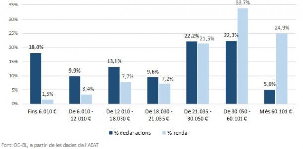 Respecte de l’any 2017, els trams de renda inferior (fins 6.010 € ) i el de 12.010 i 18.030 € són els que disminueixen el seu pes respecte el total. En canvi, augmenta el seu pes respecte el total, totes les declaracions situades en trams superiors als 18.030 €. Tenint en compte la mitjana de base imposable de cada tram, es veu com l’increment de la mitjana total de base imposable ha vingut donat sobretot per les declaracions de més de 60.101 €, que són les que més augmenten la mitjana.