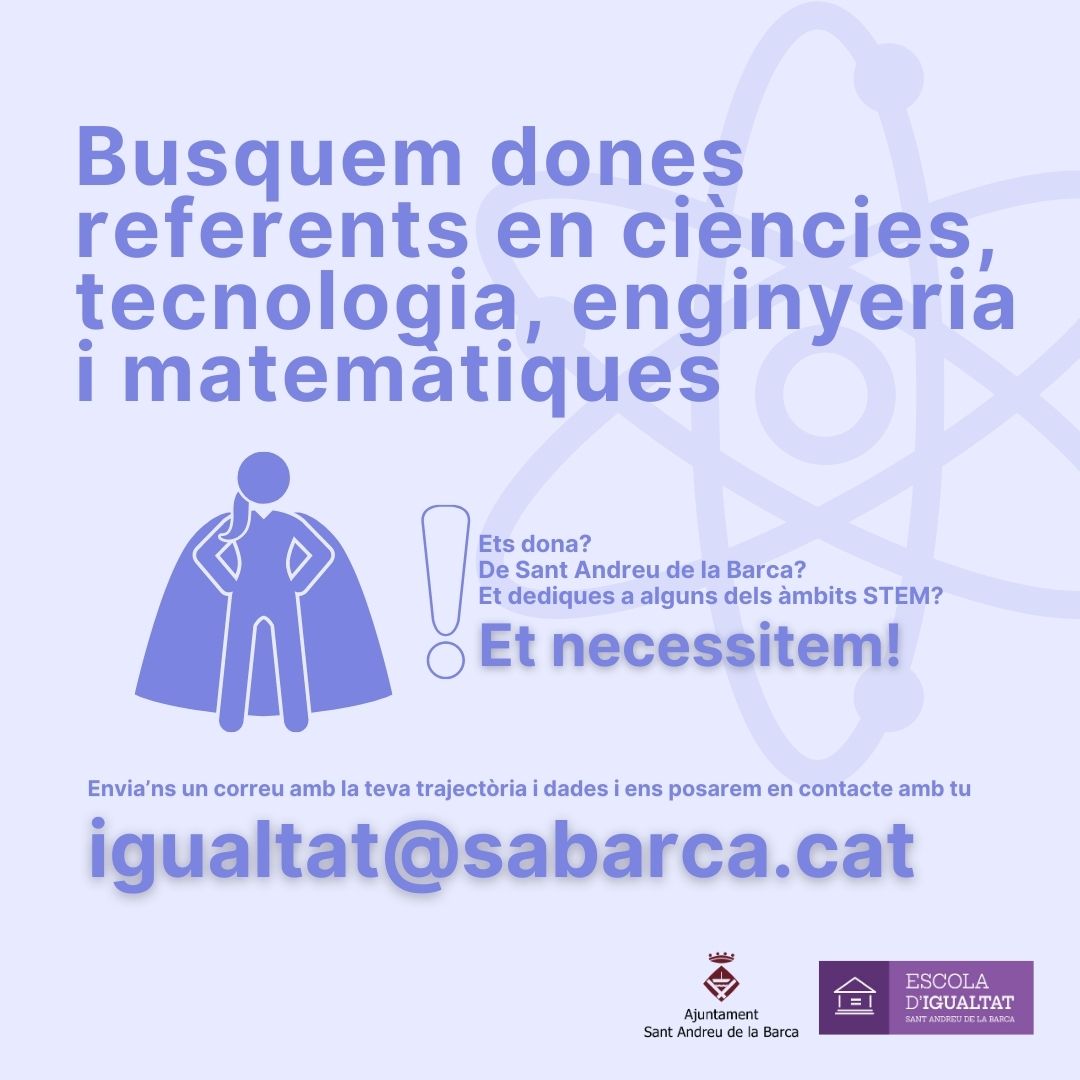 Amb l’objectiu de donar més visibilitat a aquestes professionals, des de l’Ajuntament es fa una crida a totes les dones de Sant Andreu de la Barca que es dediquin a l’àmbit STEM. Si ets dona i et dediques a les ciències, la tecnologia, l’enginyeria o les matemàtiques, envia un correu a igualtat@sabarca.cat amb el teu currículum o una breu biografia.
