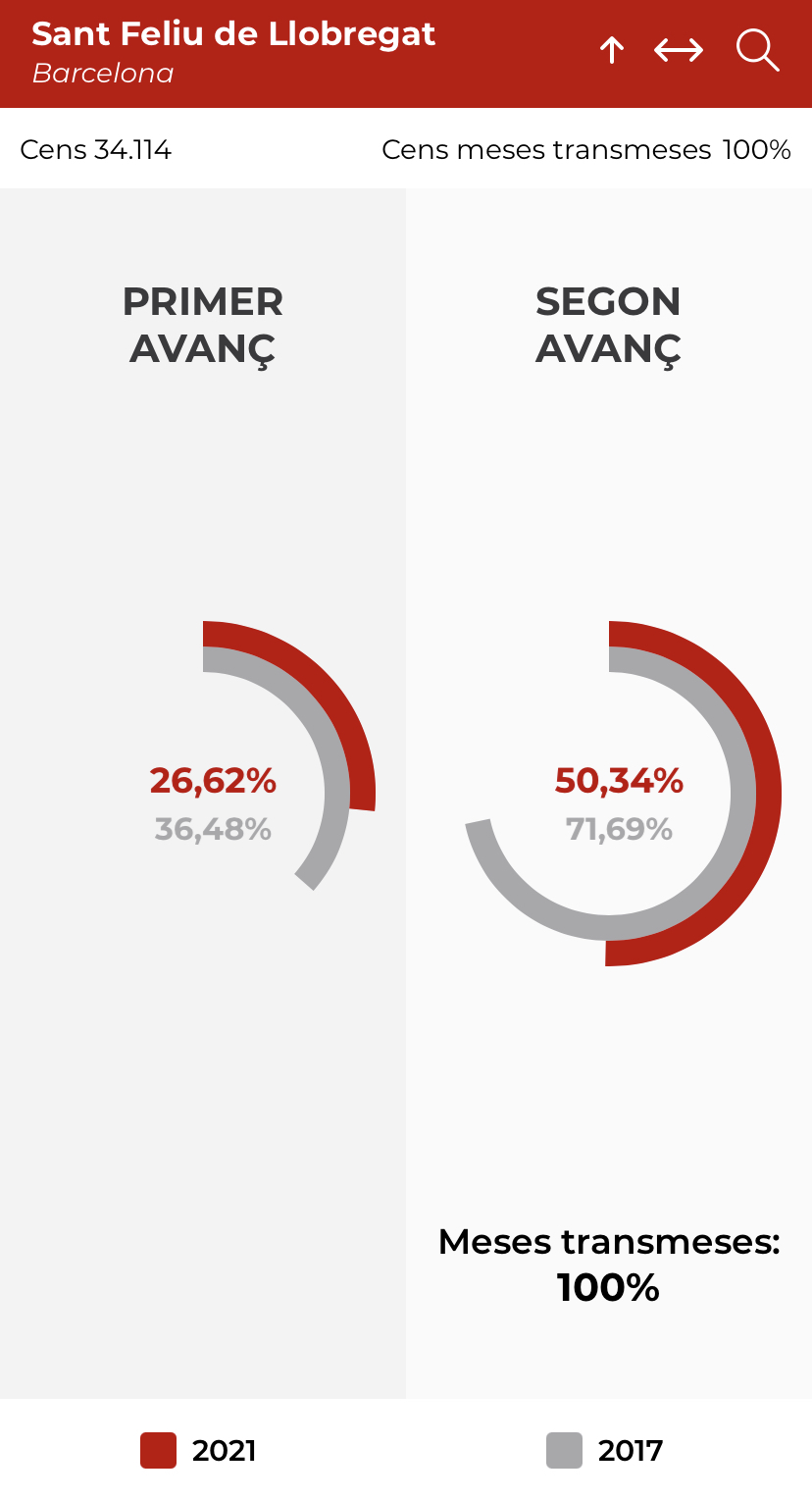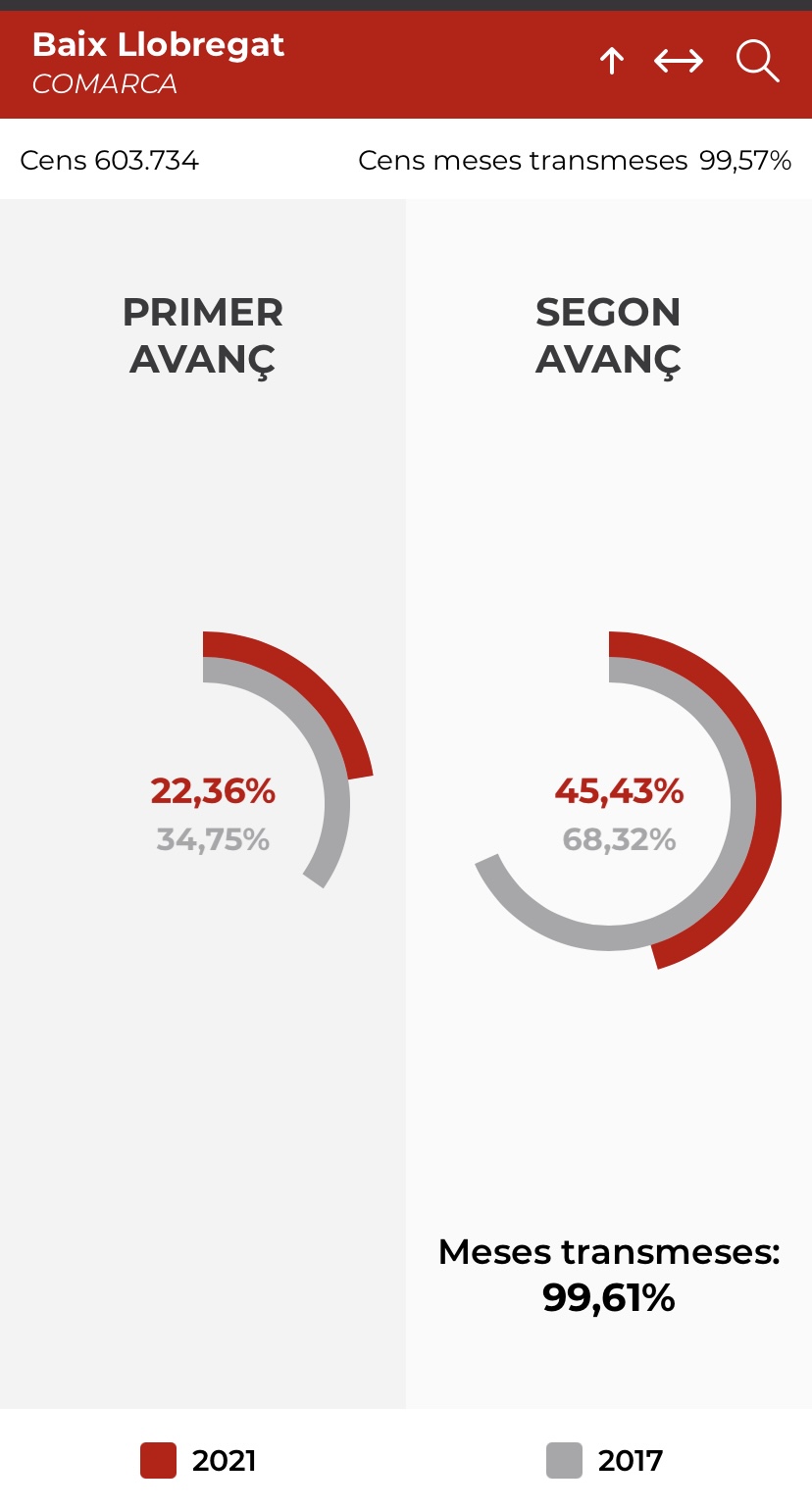 A la capital de la comarca, Sant Feliu de Llobregat, la participació ha estat a les 18 hores del 50’34 ( 71’69 al 2017). A Cornellà l’afluència a les urnes era inferior, d’un 43’44 ( 66’26 al 2017). A Martorell s’havia situat en un 45’39 ( 68’86 al 2017). A Torrelles de Llobregat ha arribat al 47’94 ( 69’16 al 2017).