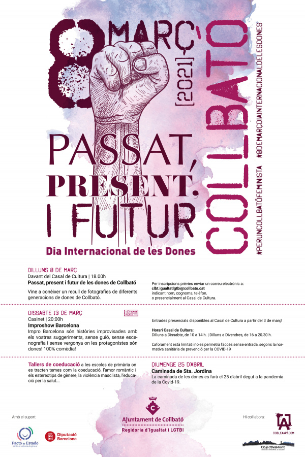 La Regidoria d’Igualtat i LGTBI de l’Ajuntament de Collbató ha programat una sèrie d’actes en commemoració de la celebració del Dia Internacional de les Dones, el 8 de març.