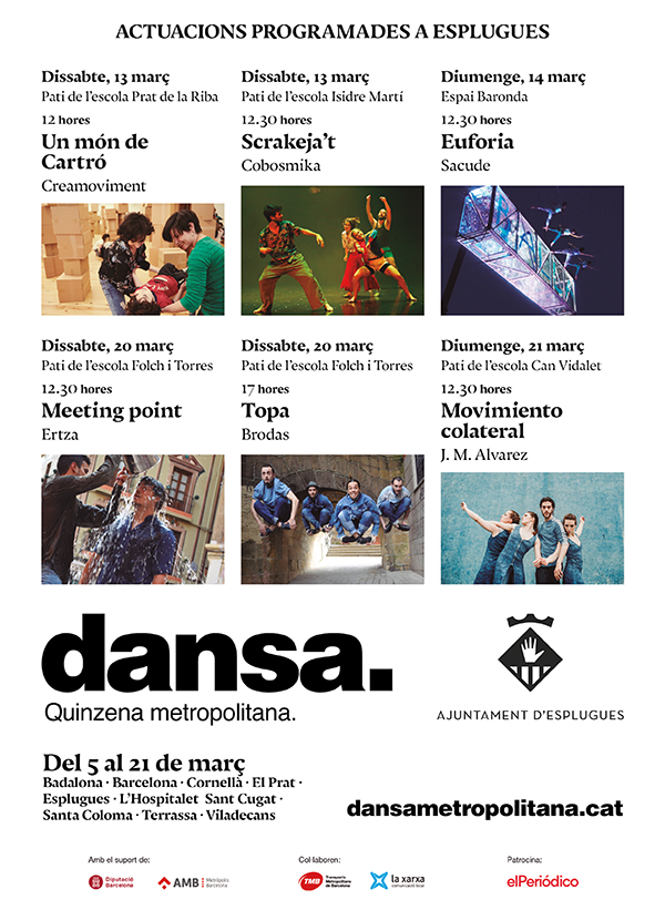 Després que l’edició de l’any passat fos cancel·lada per la irrupció de la pandèmia de Covid-19, la Quinzena de Dansa Metropolitana, de la qual forma part Esplugues des de la primera edició, anuncia la seva celebració per als caps de setmana del 13-14 i 20-21 de març sota el lema ‘Teixim complicitats’.