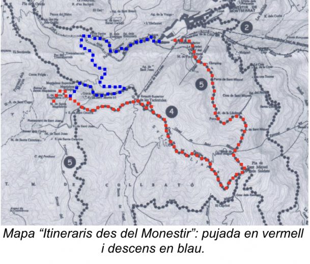 1.35 Inicio el descens, pel mateix camí, fins arribar a la cruïlla on giro a l’esquerra (pal indicador), en direcció a Sant Jeroni. Baixo per les escales de Jacob fins a l’encreuament amb el camí de Sant Jeroni (pal indicador), i aquí viro cap a la dreta en direcció a Sant Joan.