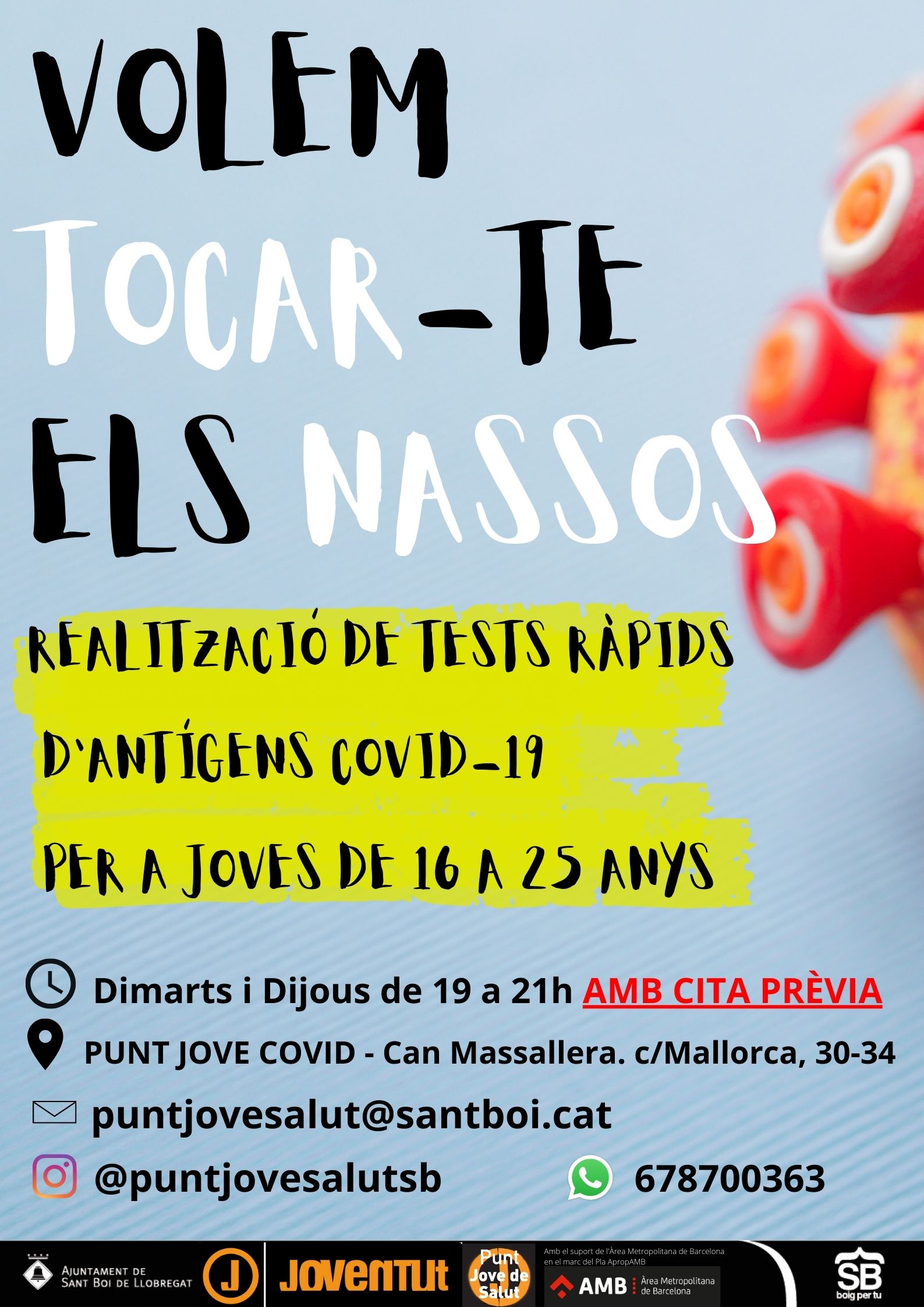 Coincidint amb la celebració del Dia Mundial de la Salut, l’Ajuntament de Sant Boi ha posat en marxa aquesta setmana la campanya ‘Volem tocar-te els nassos’, que ofereix a joves de la ciutat d’entre 16 i 25 anys la possibilitat de fer-se gratuïtament un test ràpid d’antígens.