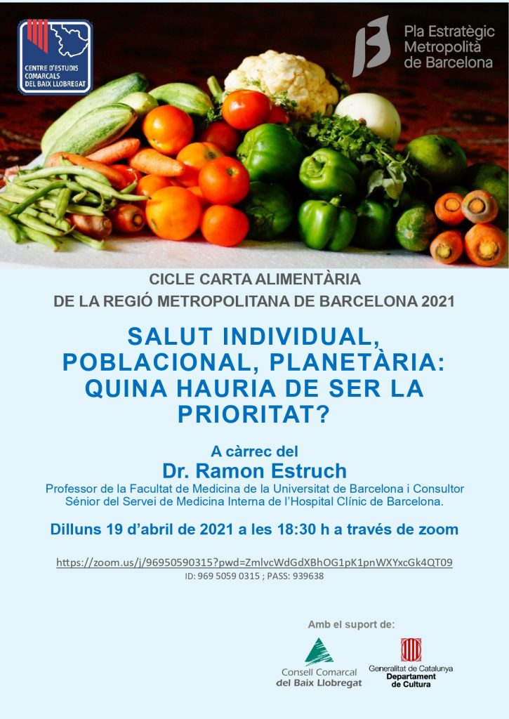 El cicle Carta Alimentària de la Regió Metropolitana de Barcelona 2021 ha organitzat una xerrada titulada “Salut individual, poblacional, planetària: quina hauria de ser la prioritat?”. La conferència anirà a càrrec del Dr. Ramón Estruch, professor de la Facultat de Medicina de la Universitat de Barcelona i Consultor Sènior del Servei de Medicina Interna de l’Hospital Clínic de Barcelona.