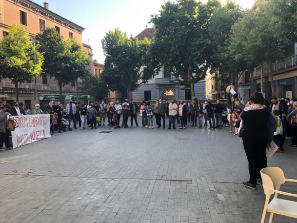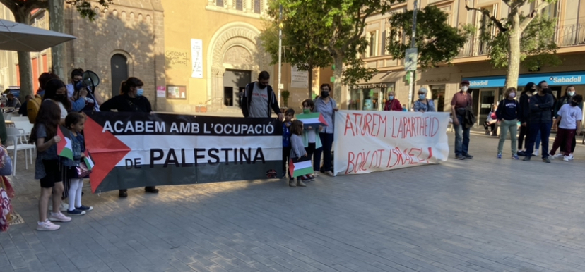 A l’entorn de dues pancartes que criticaven l’apartheid promogut per Israel i exigien acabar amb l’ocupació de Palestina, es varen escoltar dos testimonis directes de persones afectades per la violència del govern de Netanyahu i es va llegir un manifest de la “Coalició Prou Complicitat amb Israel” que demana a les institucions espanyoles i catalanes que apliquin un boicot a Israel.
