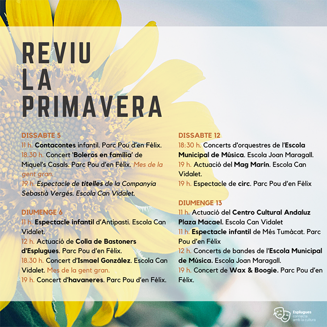 Aprofitant el bon temps i la millora de la situació sanitària, l’Ajuntament d’Esplugues ha programat per al juny, sobretot durant els tres primers caps de setmana, una vintena d’activitats culturals gratuïtes, sota el nom de Reviu la Primavera, perquè la ciutadania pugui gaudir d’espectacles a l’aire lliure.