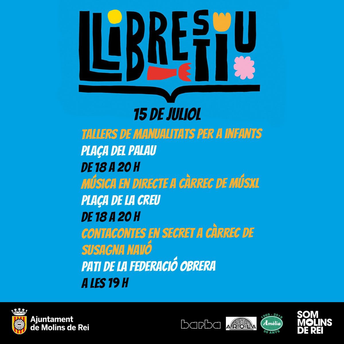 A Molins de Rei, la festa del Llibrestiu inclourà paradetes de llibres a la porta de les llibreries i diferents activitats a diversos espais de la vila. Consulta les llibreries que s’han adherit a la festa: https://llibrestiu.gremidellibreters.cat/
