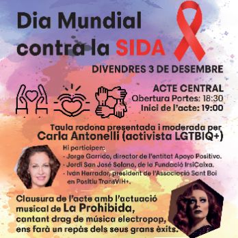 Diversos ajuntaments i organitzacions socials del Baix Llobregat commemoren aquest dimecres, 1 de desembre, el Dia Mundial de la Sida. Castelldefels, per exemple, celebrarà al teatre Plaza el dia 3 una taula rodona, moderada per Carla Antonelli, titulada “Castelldefels contra la SIDA-indetectable =intransmissible”, que acabarà amb una actuació de La Prohibida. I a Sant Joan Despí, el mateix dia 1, El Bulevard, Casal de Joves, ha organitzat un acte per parlar de les malalties de transmissió sexual d’una forma diferent amb la col·laboració del Grup LGTBIQ+ del Bule.