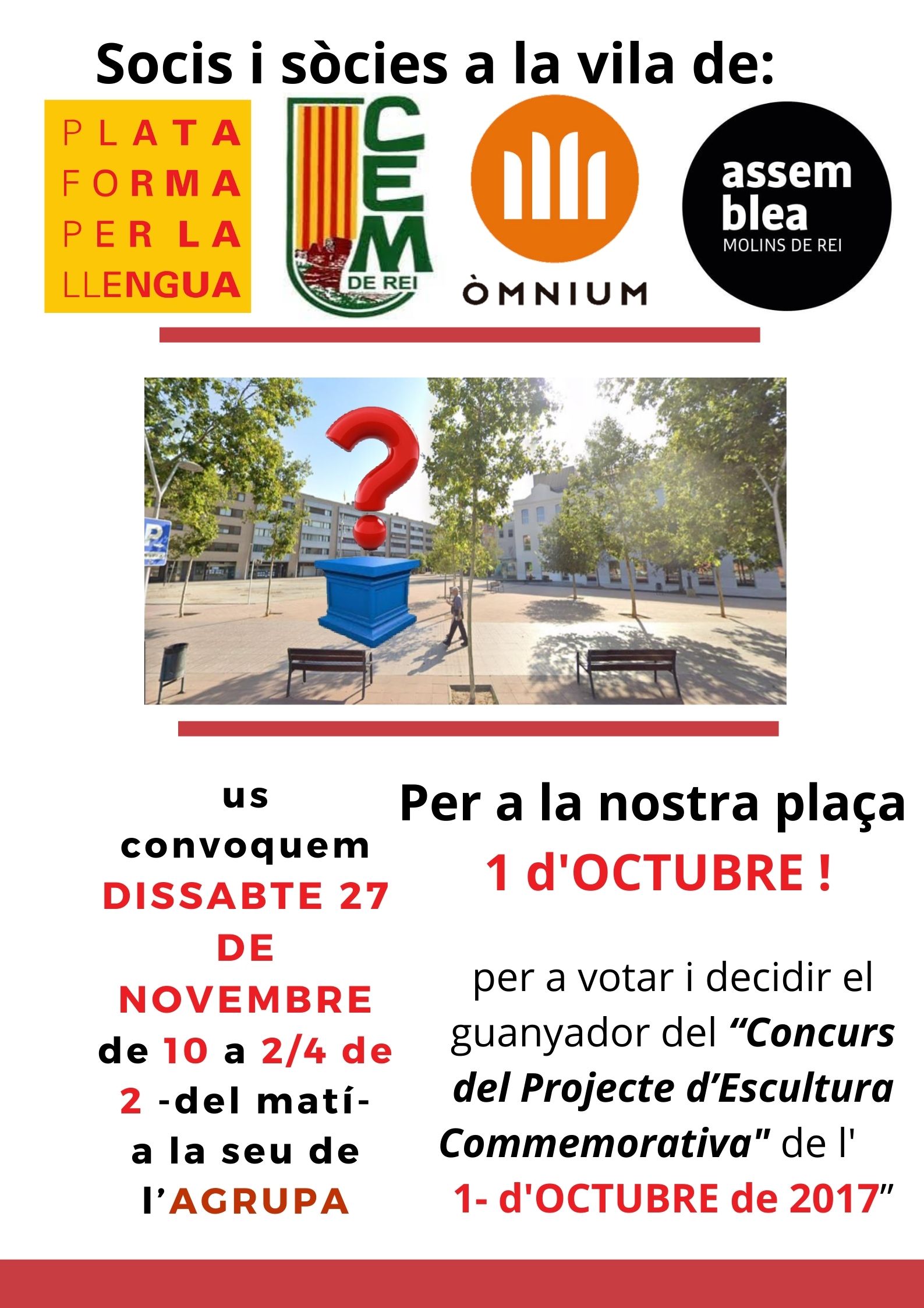 Convocaven les votacions ANC, Òmnium, CEM i Plataforma per la Llengua i ara han donat a conèixer els resultats. Es van presentar set propostes dels artistes Albert Camats, Raül Carretero, Roser Garriga, Jaume Miquel i família, Josep Maria Pubill i Josep Riulas. L’obra elegida per les 119 persones que van votar va ser la de Roser Garriga Pujol que ara haurà de dur-la a terme per tal que es pugui instar a la plaça 1 d’octubre. Garriga és una reconeguda escultora i artista visual.