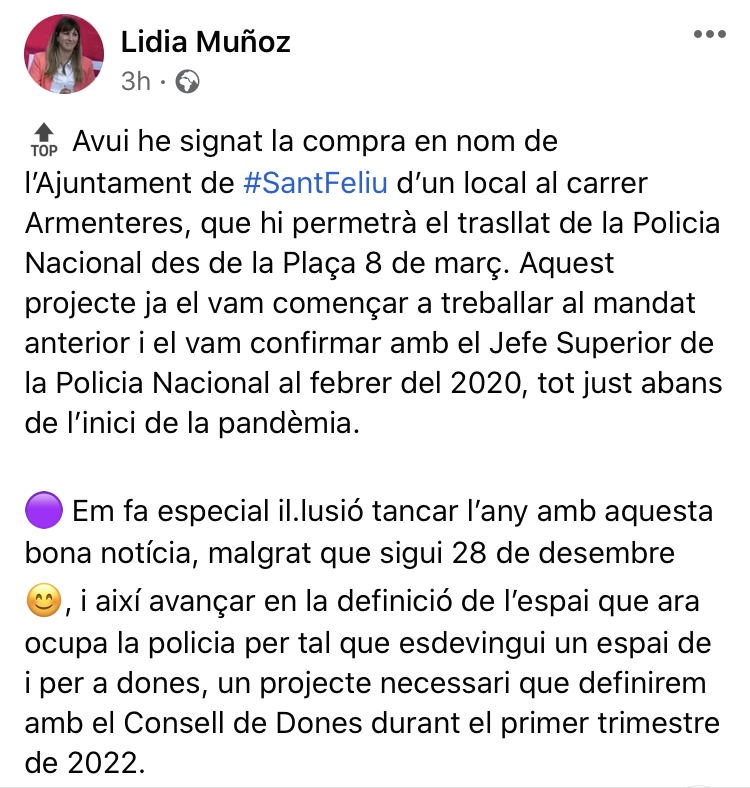 El matí del 28 de desembre l’alcaldessa de Sant Feliu, Lídia Muñoz, ha signat la compra d’un local ubicat a la plaça d’Elisabeth Eidenbenz de la capital baixllobregatina, on l’Ajuntament ha anunciat que es traslladarà la comissaria de la Policia Nacional, actualment ubicada a la plaça del Vuit de Març