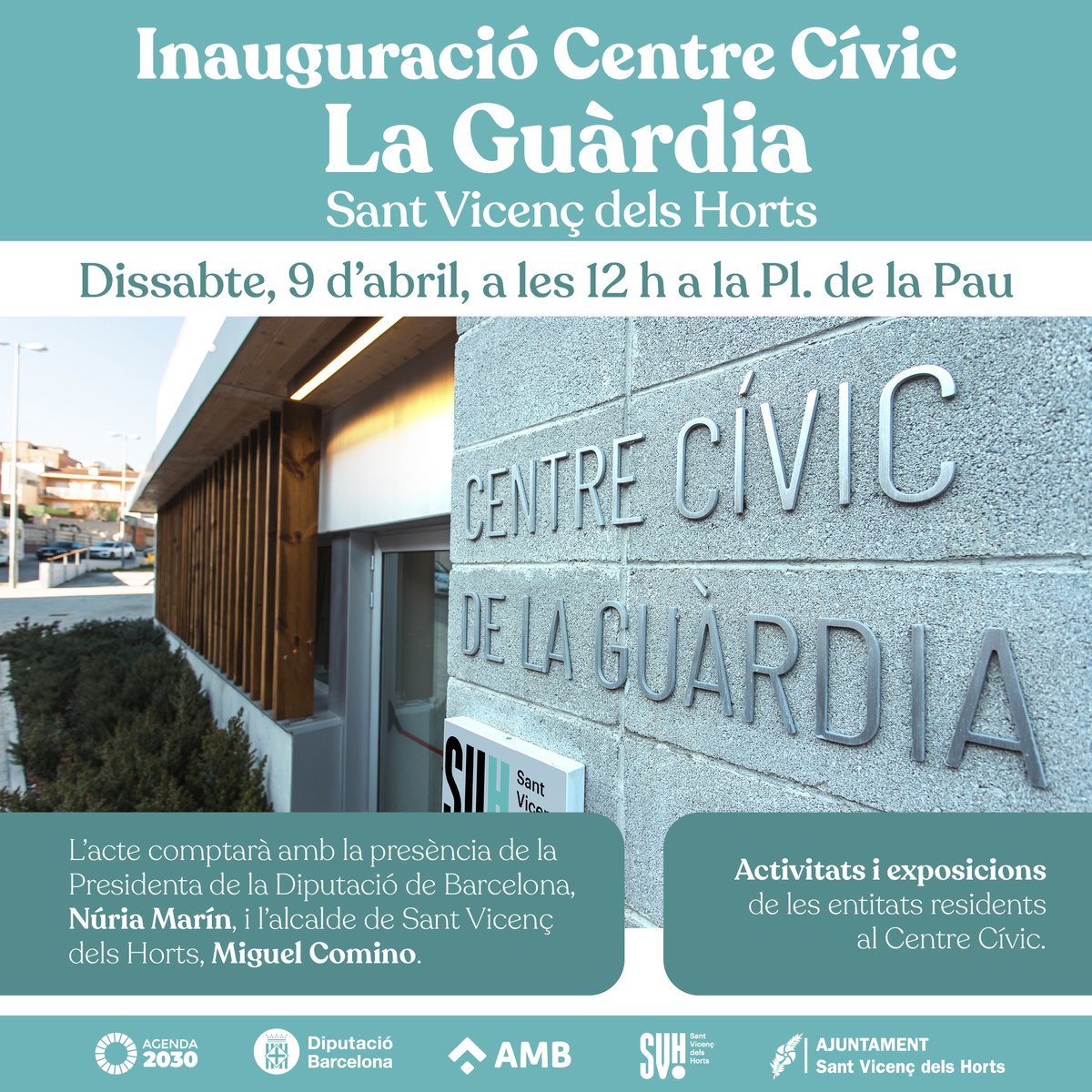 Aquest dissabte, dia 9 d’abril, ha obert les portes, amb l’anunciada presència de l’alcalde de la ciutat, Miquel Comino, i la presidenta de la Diputació de Barcelona, Nuria Marín, el Centre Cívic “La Guàrdia” de Sant Vicenç dels Horts. Es tracta d’un nou equipament que neix amb la voluntat de dinamitzar el barri i les entitats. I un exemple de cooperació entre diverses institucions.
