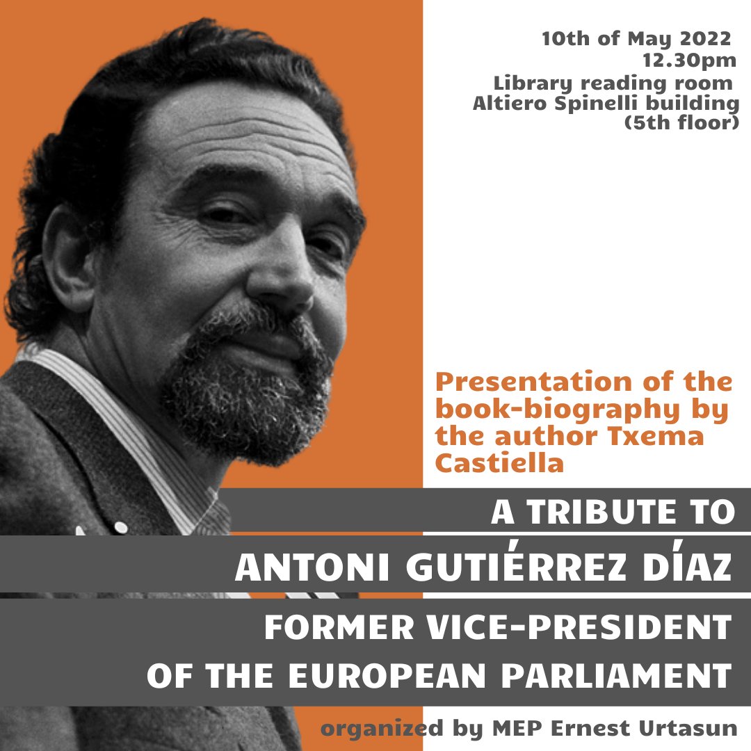 Antoni Gutiérrez Diaz (1929-2006) fou secretari general del PSUC, un dels màxims dirigents de l’Assemblea de Catalunya, l’òrgan unitari de lluita contra el franquisme, conseller de la Generalitat en el govern presidit per Josep Tarradellas i diputat al Parlament de Catalunya. Fou un dels impulsors del corrent polític denominat eurocomunisme, que seguia l’estela d’Enrico Berlinguer, secretari general del Partit Comunista Italià (PCI) . Europeista convençut, va ser eurodiputat des de l’any 1987 fins el 1999, ocupant la vicepresidència del Parlament europeu entre el 1994 i el 1999. Aquest dimarts, el Parlament Europeu li ret un homenatge, organitzat per l’eurodiputat Ernest Urtasun.