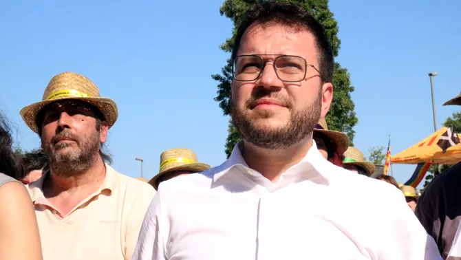 Ahir, el president Aragonès (a la fotografia) es va veure obligat a caviar el discurs i a replicar Jordi Sánchez des de Sant Boi de Llobregat. Aragonès va afirmar, visiblement molest: “No ens despistem. El nostre adversari són els qui ens espien, qui ens nega el dret a l’autodeterminació”.