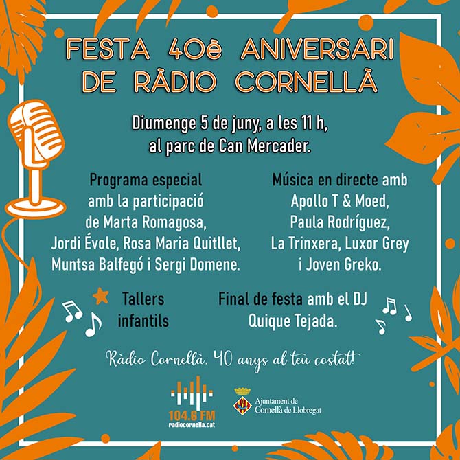 Ràdio Cornellà celebra el seu quarantè aniversari amb una festa aquest diumenge 5 de juny. Al costat del llac del parc de Can Mercader d’11 del matí a 2 de la tarda es col·locarà un escenari per on passaran artistes i grups emergents de Cornellà i on s’entrevistaran alguns dels professionals de la comunicació consagrats que van començar la seva carrera a l’emissora municipal.