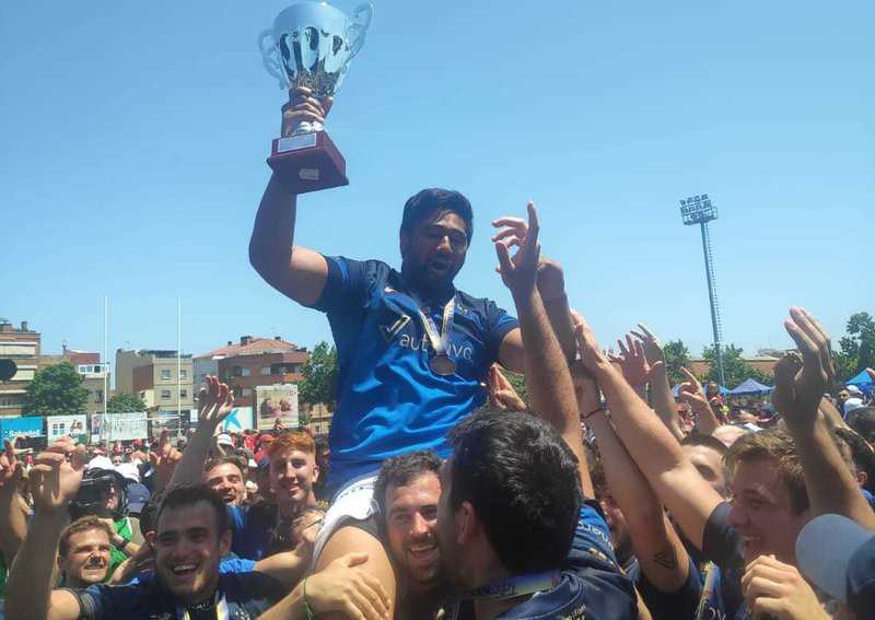 Rugbi. Final Santboiana-Ordizia. Afa Tauli, el capità, amb la copa Foto: Eric Alegre
