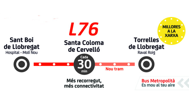 No tot són males notícies pel que fa al servei d‘autobusos metropolitans al Baix Llobregat. A partir d’aquest dissabte, 16 de juliol, la línia L76 de Bus metropolità que connecta Sant Boi de Llobregat amb Santa Coloma de Cervelló, també arriba a Torrelles de Llobregat.