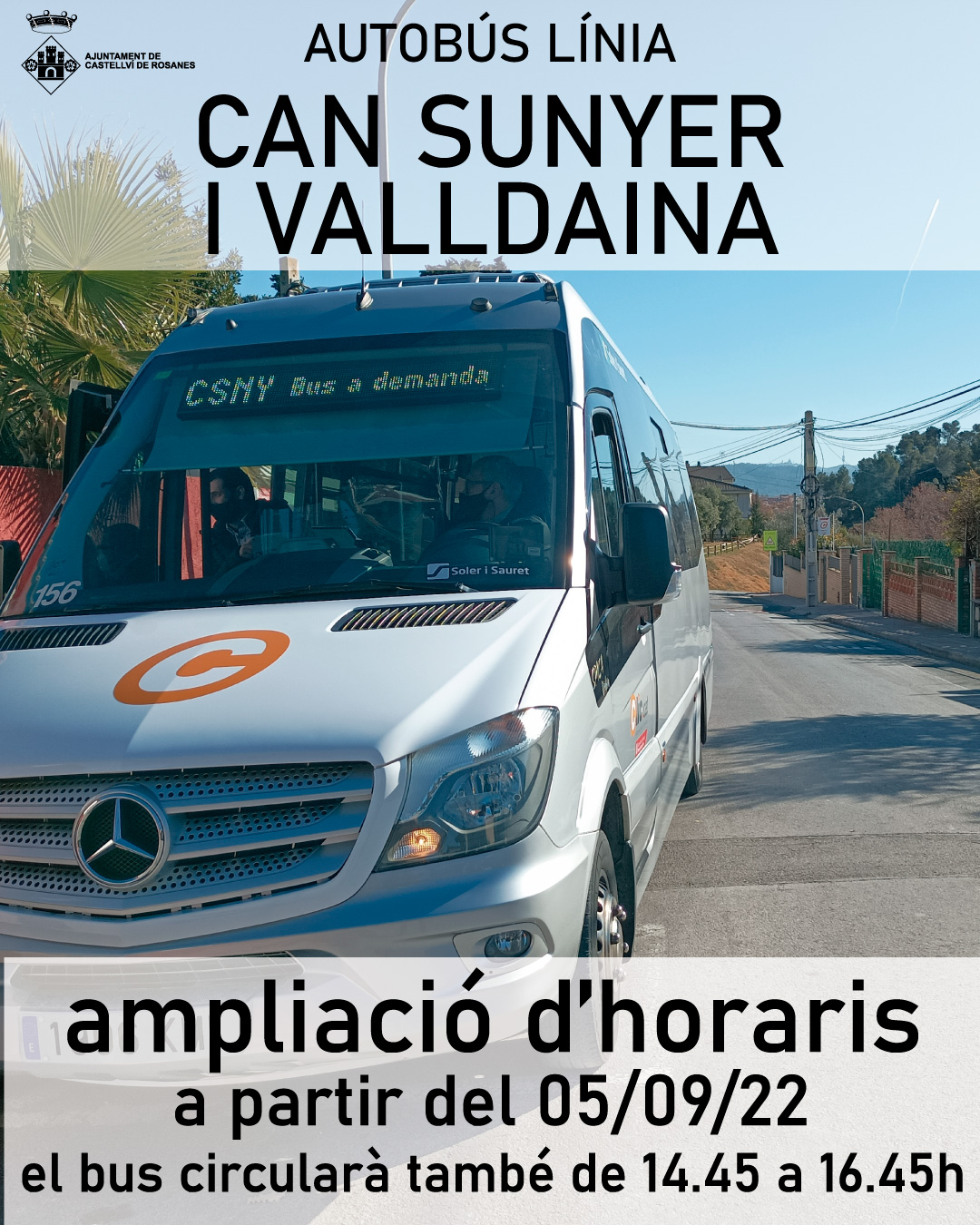 A partir del proper dilluns, 5 de setembre, el servei de bus a la demanda ( a la fotografia)  de la línia de Can Sunyer i Valldaina de Castellví de Rosanes per enllaçar amb Sant Andreu de la Barca funcionarà de dilluns a divendres feiners de dos quarts de 8 del matí a la 1 del migdia i de ¾ de 5 fins a un quart de vuit a la tarda ( excepte l’agost).  La novetat que es posa en marxa incorpora l’increment de servei també entre ¾ de 3 i ¾ de 5, una franja horària que fins ara estava sense servei.