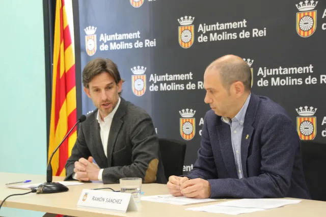A Molins de Rei, el candidat serà Xavi Paz, l’actual alcalde, que governa gràcies a un pacte amb Junts per Catalunya (a la fotografia, amb el primer tinent d’alcalde, Ramon Sánchez, de Junts). Paz va ser escollit per unanimitat el passat dissabte, 5 de novembre, en una assemblea extraordinària de l’agrupació del PSC celebrada a la Federació Obrera.